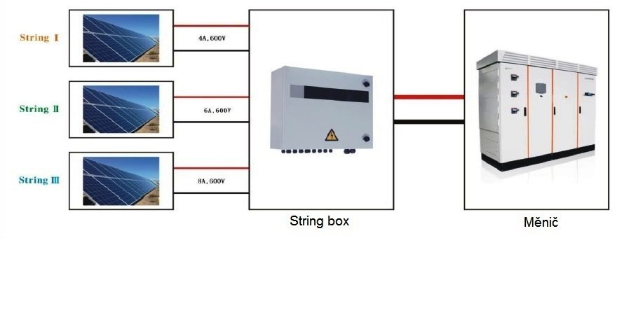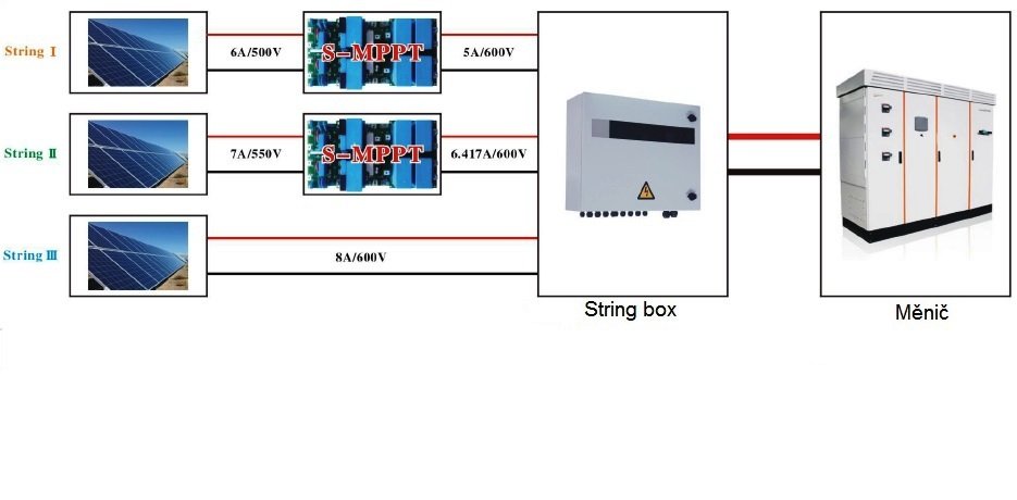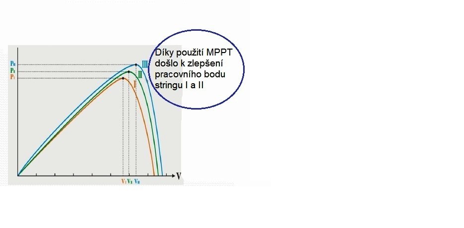 Díky použití S-MPPT boxu s DC/DC měničem může každý string pracovat ve vyšším bodu pracovní charakteristiky.