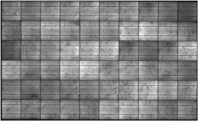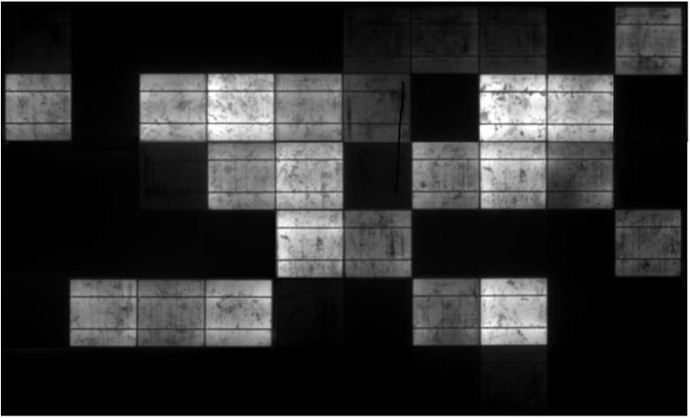 Na luminiscenčním snímku je vidět pokročilejší degradace FV článků vlivem PID. PID jsou zasaženy FV články téměř po celé ploše. U některých FV článků degradace pokročila natolik, že již neprodukují žádný výkon - černé články. PID má zásadní vliv na pokles výkonu FV panelu o více jak 36 %