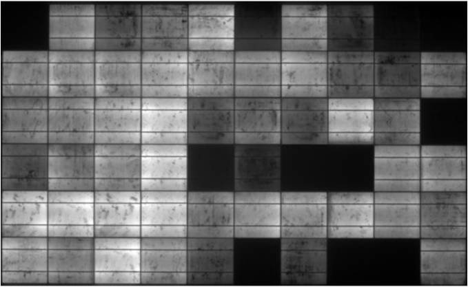 Na luminiscenčním snímku je vidět velmi pokročilá degradace FV článků vlivem PID. Degradací jsou zasaženy FV články téměř na celé ploše. PID degradace je již tak pokročilá, že ztráta výkonu činí téměř 67%